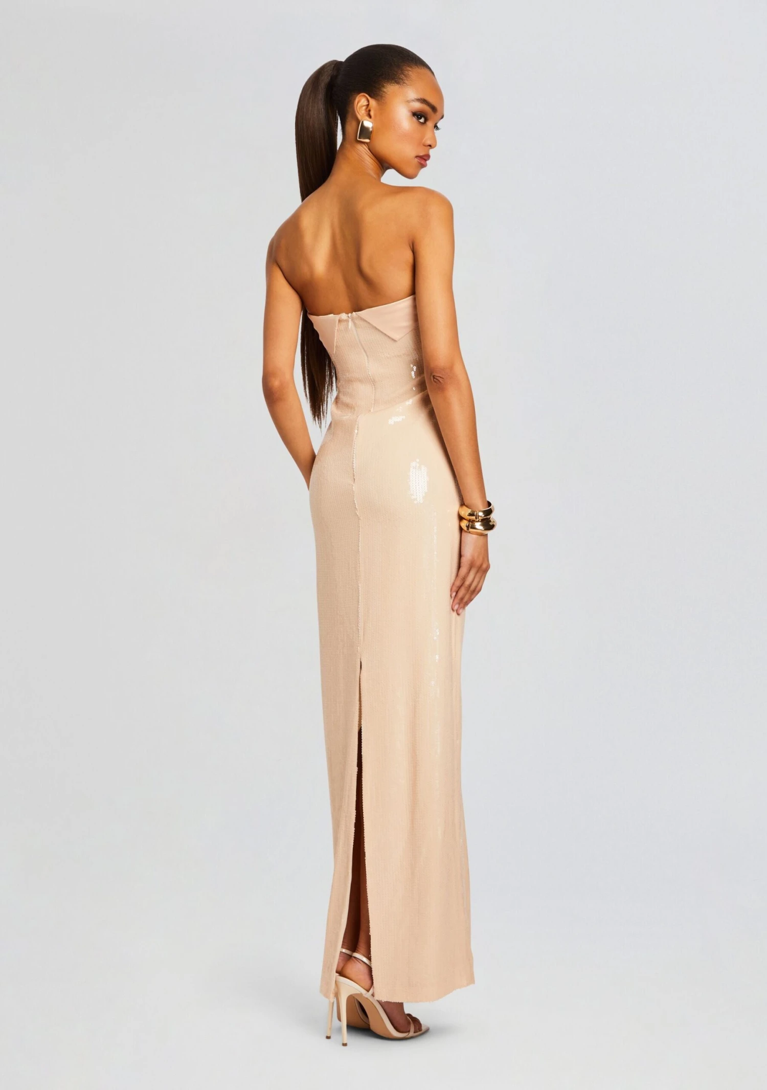 Step into the spotlight with our Alexandra Dress, adorned with shimmering sequins and featuring a satin fold-over for a touch of elegance. With a sophisticated slit in the back, this dress is designed to turn heads and make a statement at any event, offering both glamour and grace. Whether you’re attending a gala, red carpet event, or a glamorous soirée, this dress will elevate your style and command attention. Shown here in Nude.