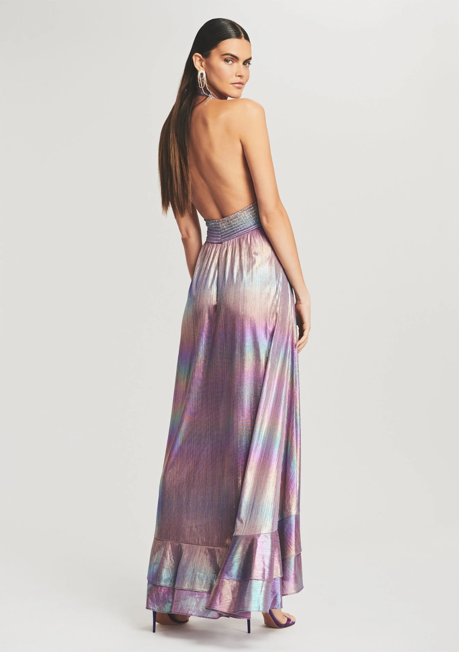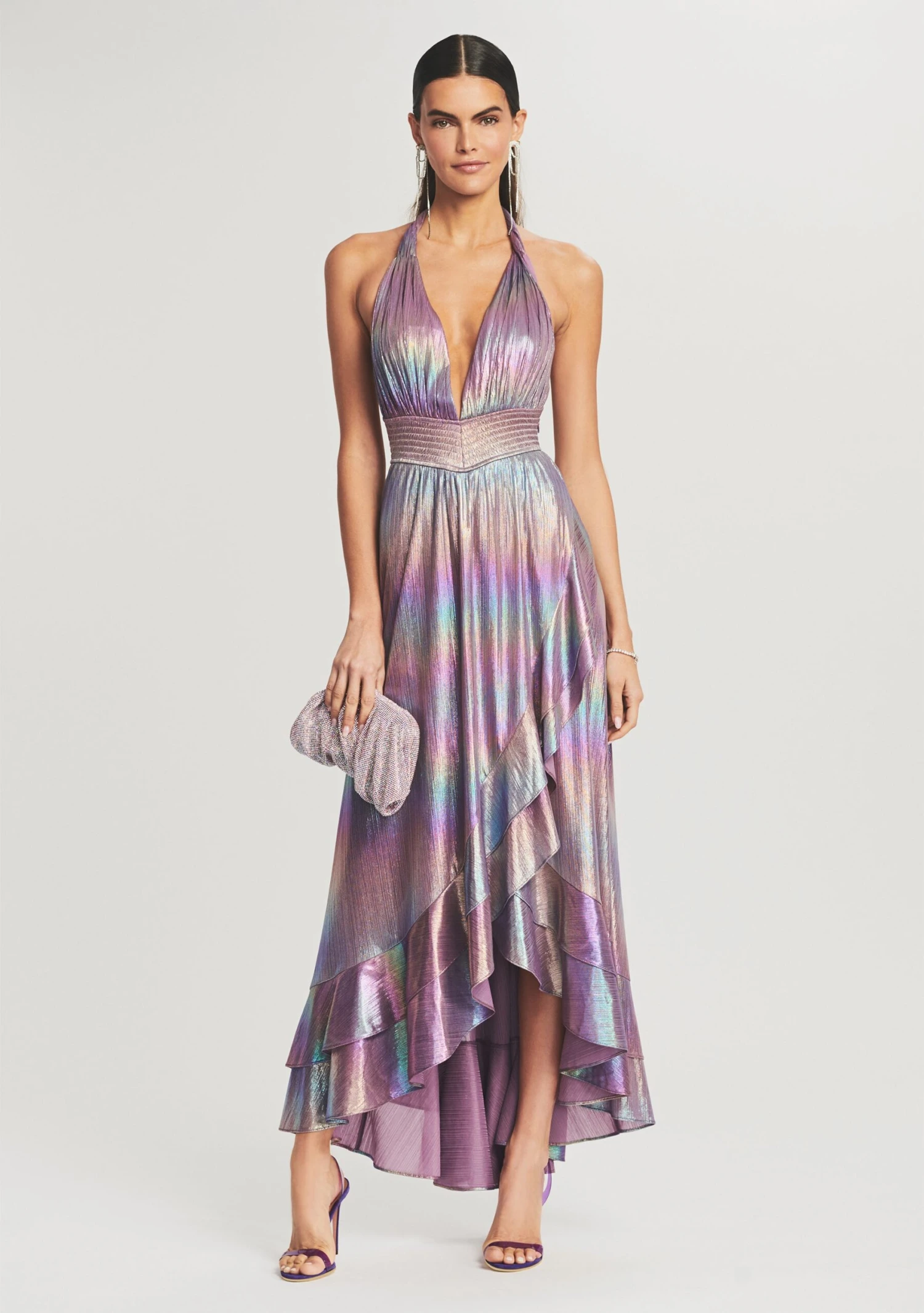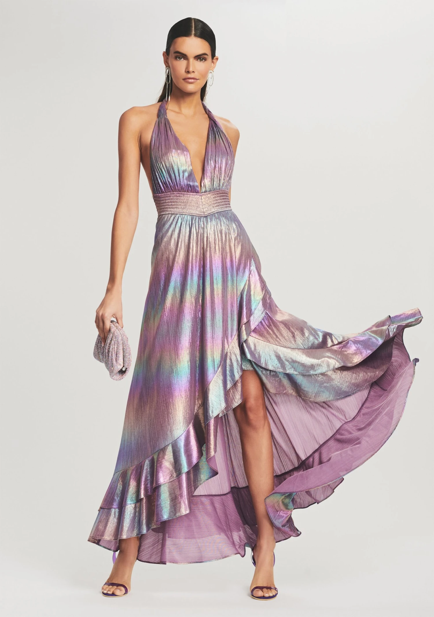 Sophisticated by design, reach for the Calico Maxi Dress for your next formal affair. The halter neck, lamΓ© silhouette features a smocked waist and a daring deep v-neckline. Its asymmetrical ruffled hem is complemented by high-low detailing. Shown here in Lilac Aurora.