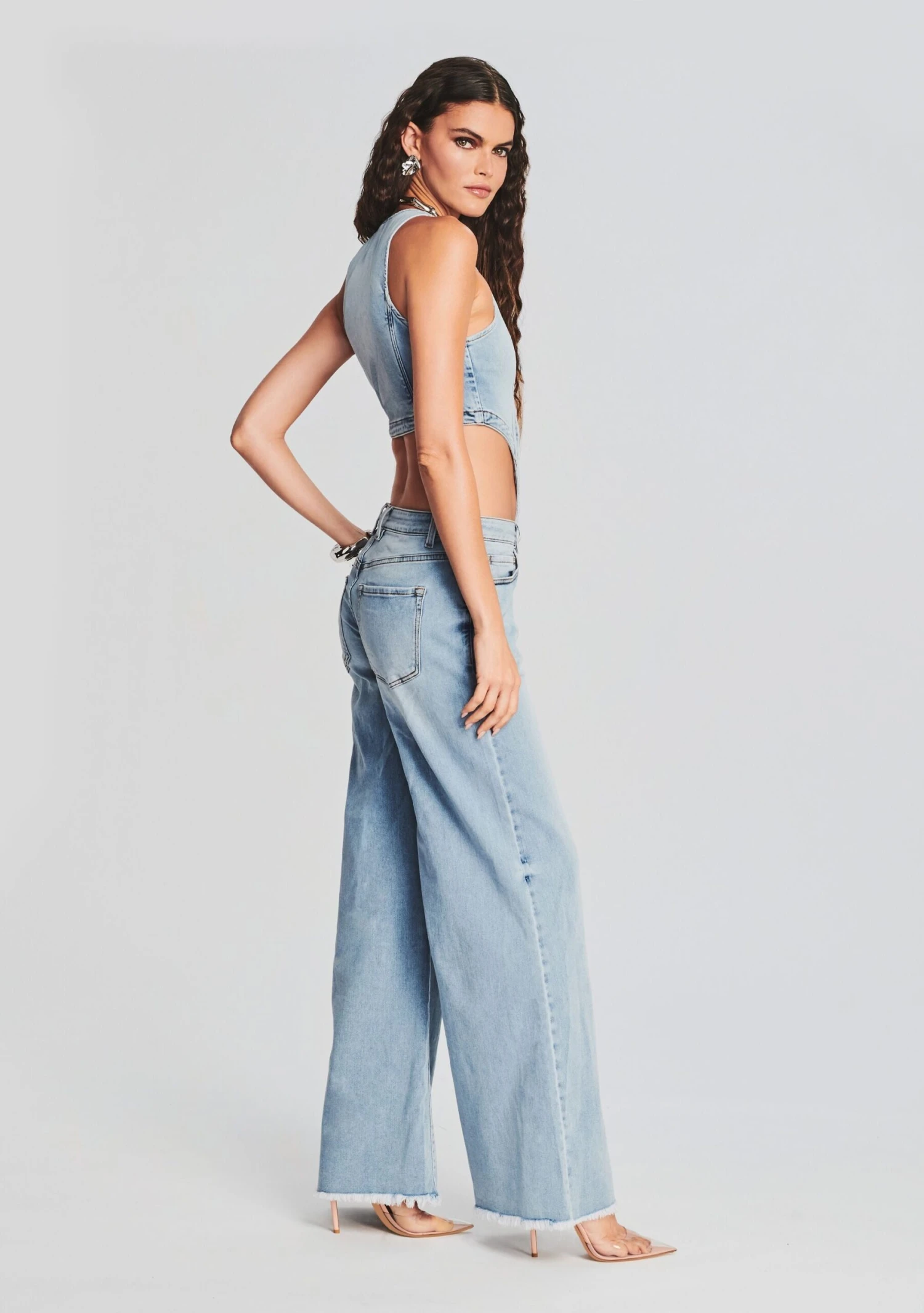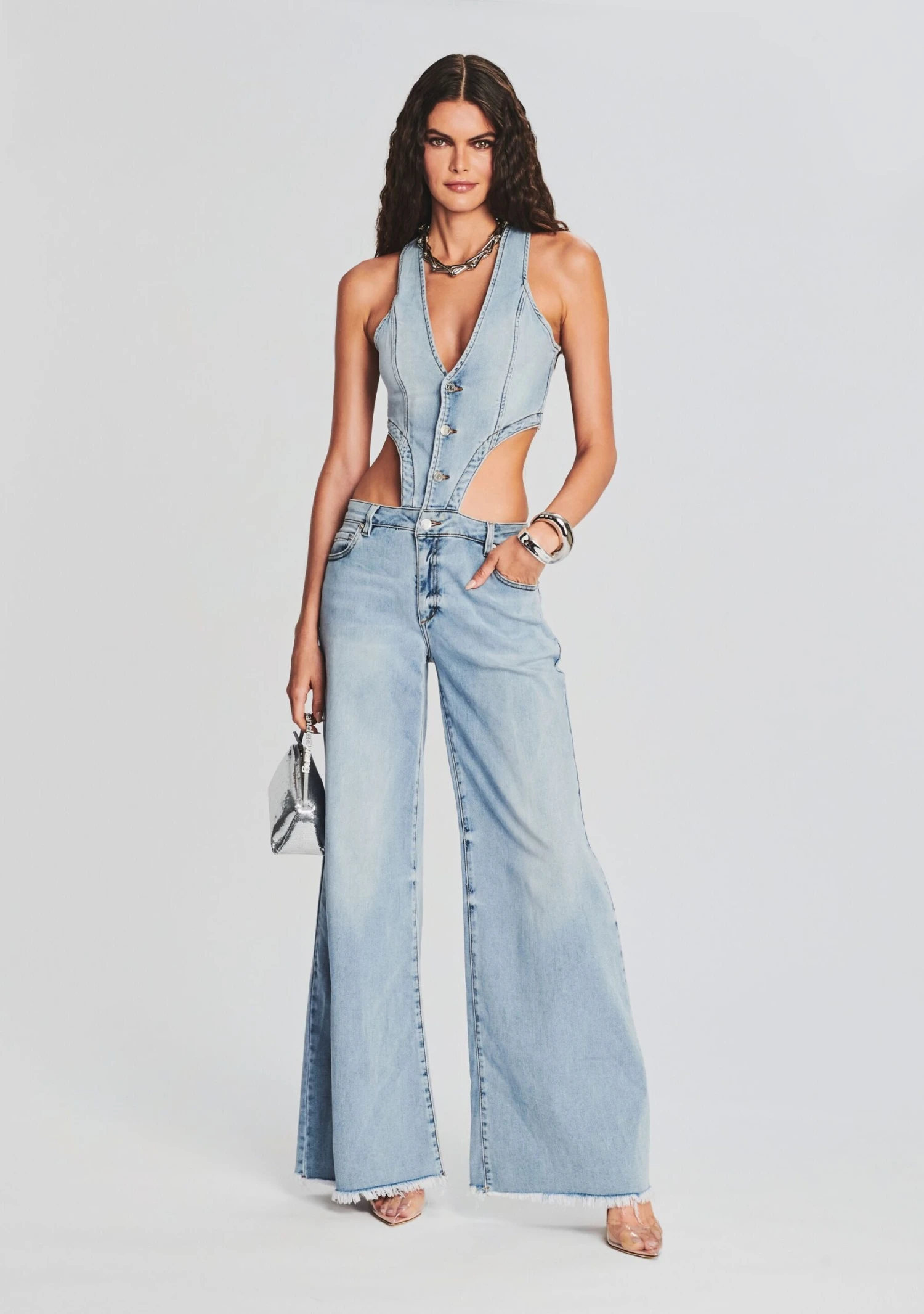 Dare to be bold in SER.O.YA’s Dallas Denim Jumpsuit. This coordinated one-piece features a low-cut bodysuit with striking side cutouts, center buttons, and low-rise baggy pants. Shown here in Coastline.