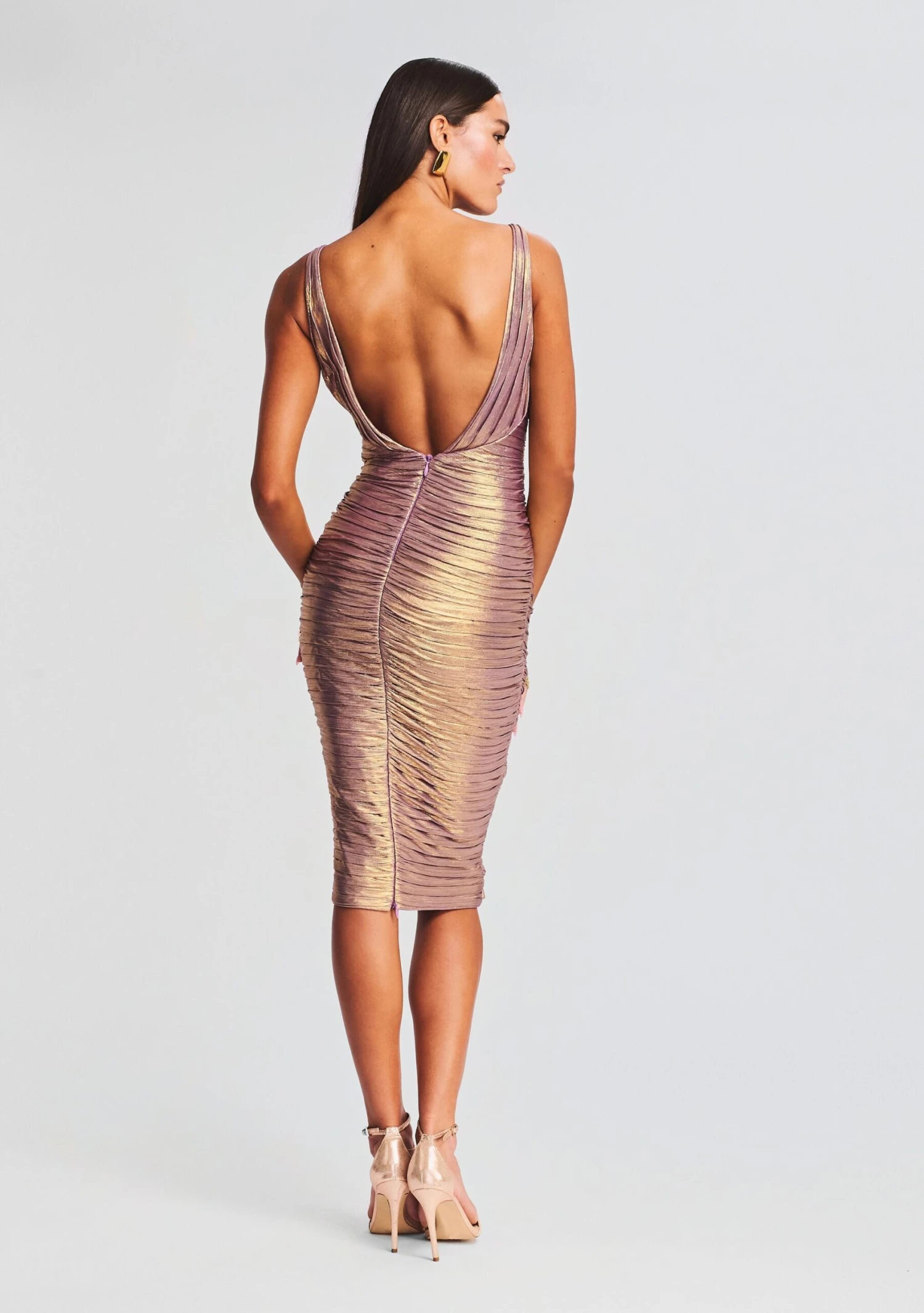 Introducing our Ivy Dress – this cocktail dress is an exquisite masterpiece that seamlessly blends elegance and allure. This Knee-Length Dress is adorned with pleating throughout, creating a mesmerizing texture that dances with your every move in shimmering shades of gold and purple. Shown in Purple/Gold.