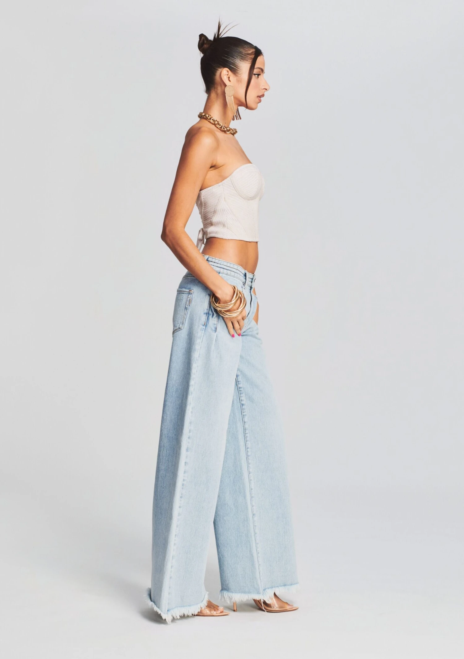 The Lorena Jean is a light-wash, medium-rise jean with an exaggerated wide leg. It’s complete with frayed hems and a two button closure at the waist. Shown here in Vivid.
