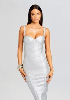 Step into the spotlight with our Mallory Dress, a captivating ensemble crafted to exude grace and sophistication. Featuring a seductive slit and subtle cutout detail, this gown boasts a flattering silhouette that effortlessly enhances your natural beauty, making it the epitome of timeless glamour. Shown here in Metallic Bronze.