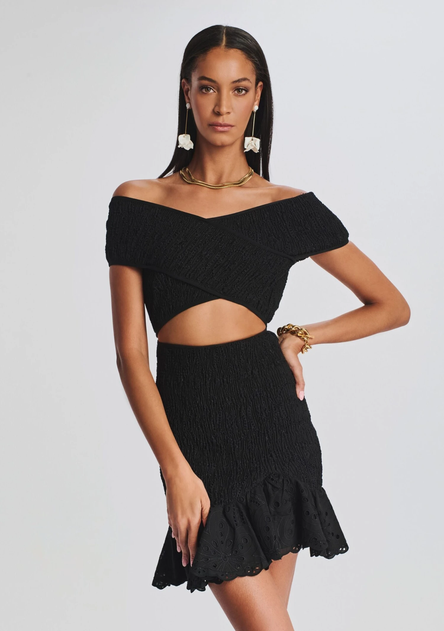 The Nella Dress by Charo Ruiz is a short and sweet shirred style. Its criss-cross straps create an elegantly wide neckline, while cutouts at the waist enhance an hourglass silhouette. It’s complete with a fitted skirt featuring asymmetric guipure crochet detail. Shown here in Black Fruition.