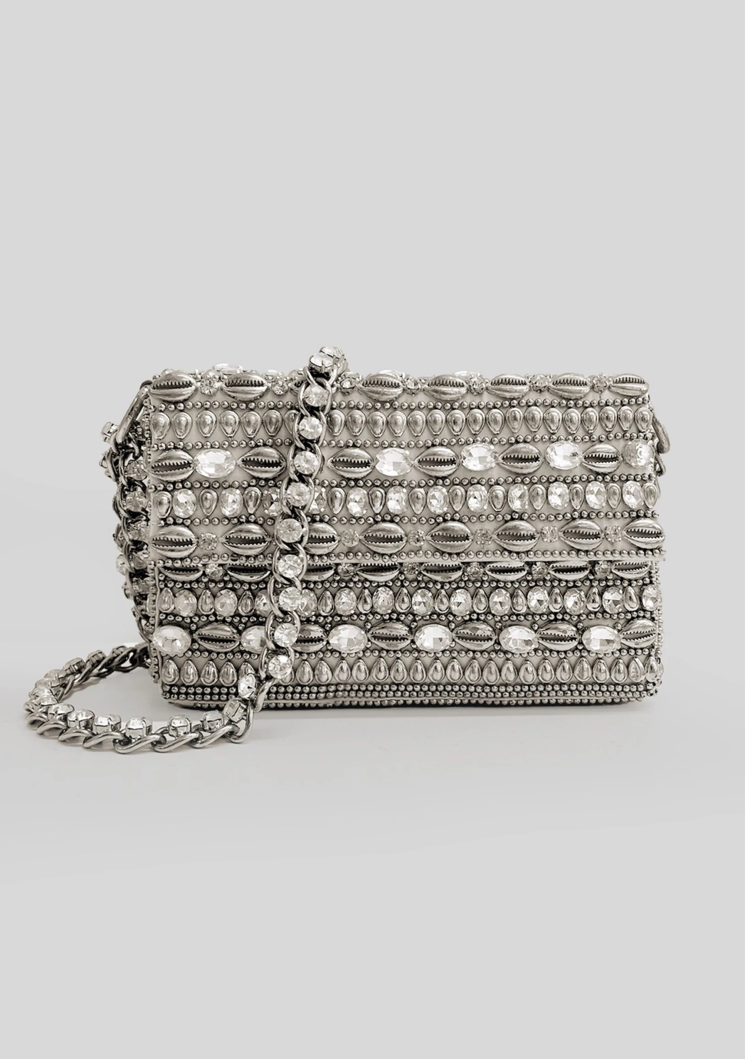 Shine through the night with our Pluto Seashell Bag. This sleek shoulder bag is covered in oversized crystal embellishments and features a front flap closure with adjustable chain straps. Shown here in Silver Crystal Seashell.