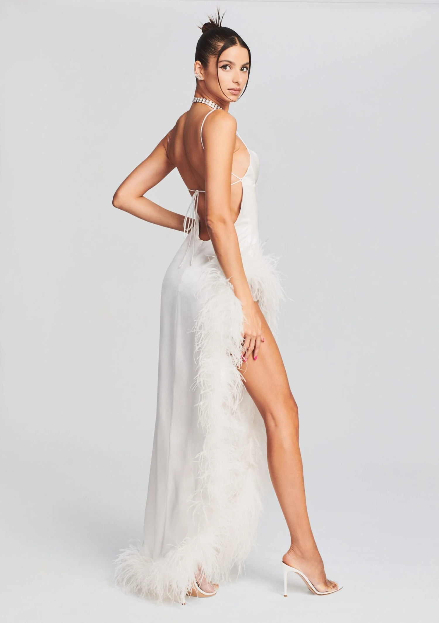 Add some flair to your next evening out with our Priscilla Feather Dress. This otherwise simple silk gown is instantly elevated by its feather trim along its thigh-high slit. This style also features a slightly draped cowl neck and barely-there straps that tie and adjust at the back. Shown here in White.