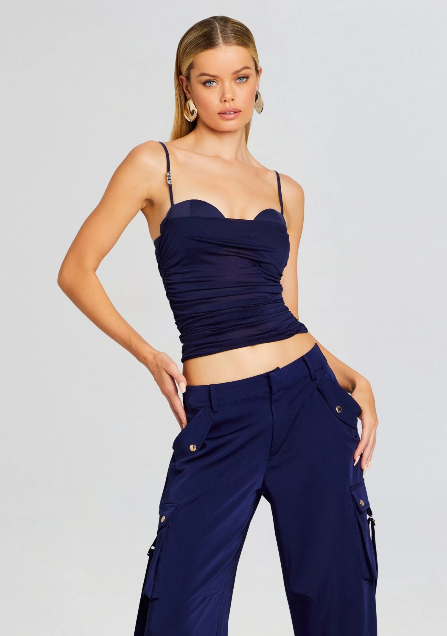 Revamp your summer wardrobe with SER.O.YA’s Reyes Top.The ruching throughout adds texture and dimension to this tank top, while the peek-a-boo cup detail adds a flirty touch to the neckline along with an iconic SER.O.YA emblem on the strap. Shown here in Navy.