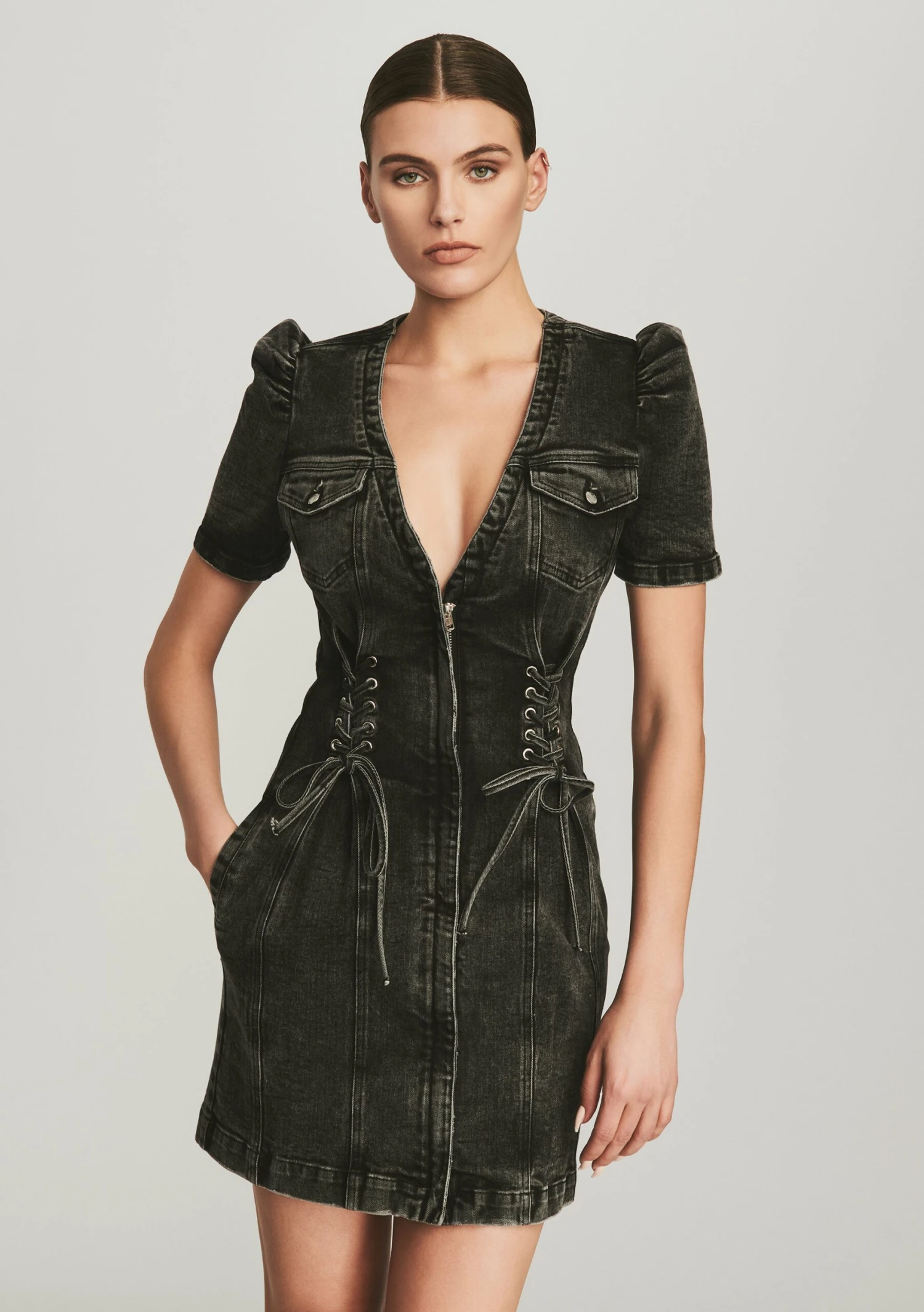 The Stasha Dress takes an edgey twist on a classic denim mini and is accented with lace-up sitching and puffed sleeves. The vintage-inspired wash is shown here in Obsidian Black.