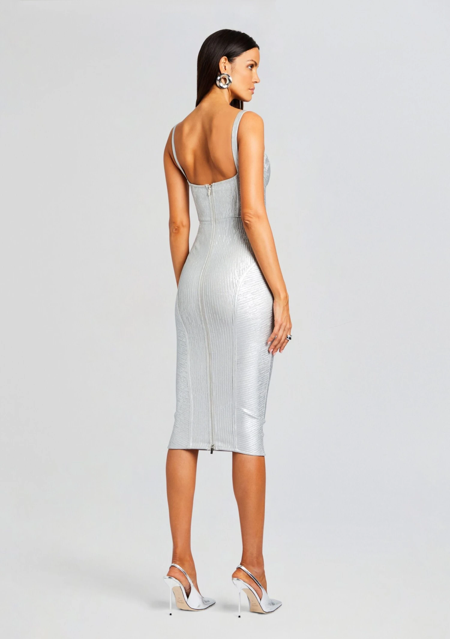Achieve effortless glamour with our Zora Dress. This coated knit, knee-length dress featuring a striking bustier cupped top is guaranteed to keep you both cozy and chic. This dress is your ticket to commanding the spotlight and leaving a lasting impression. Shown here in Silver.